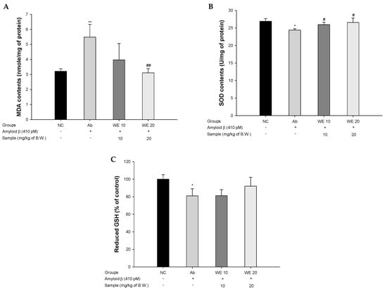 To evaluate the antioxidant system in Aβ1-42-induced mice, MDA levels, SOD levels, and reduced glutathione GSH levels were assessed (Figure 4). The MDA of the Ab group (5.49 nmol/mg of protein) was significantly produced compared to the NC group (3.22 nmol/mg of protein). On the other hand, the administration of walnut extract showed a reduced MDA level in the WE groups (3.97 nmol/mg of protein and 3.11 nmol/mg of protein; WE 10 and WE 20, respectively). In particular, those of the WE 20 group was significantly reduced compare to Ab group. The SOD levels of the Ab group (24.39 U/mg of protein) decreased compared with the NC group (26.92 U/mg of protein). The SOD levels of both WE groups (25.94 U/mg of protein and 26.57 U/mg of protein; WE 10 and WE 20, respectively) were significantly increased compared with the Ab group. The GSH levels of the Ab group (80.92% of control) was reduced compared to that of the NC group (100% of control). However, the reduced GSH levels of the WE groups (81.16% of control and 91.99% of control; WE 10 and WE 20, respectively) were higher compared to the Ab group. In particular, those of the WE 20 group was considerably increased compare to Ab group.