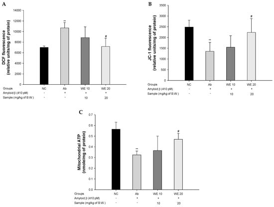 To assess mitochondrial function in Aβ1-42-induced mice, ROS production, MMP, and ATP levels were evaluated (Figure 6). The ROS production of the Ab group (10684.25 relative units/mg of protein) increased compared to that of the NC group (7013.25 relative units/mg of protein) (Figure 6A). However, the WE groups (8854.32 relative units/mg of protein and 7175.47 relative units/mg of protein for the WE 10 and WE 20 groups, respectively) showed considerably decreased DCF production compared with the Aβ group. The MMP of the Ab group (1357.57 relative units/mg of protein) was reduced in comparison with the NC group (2486.25 relative units/mg of protein) (Figure 6B), whereas that of the WE groups (1545.25 relative units/mg of protein and 2235.12 relative units/mg of protein for the WE 10 and WE 20 groups, respectively) improved compared to the Ab group. The ATP content of the Ab group (0.32 nmole/mg of protein) decreased compared to that of NC group (0.56 nmole/mg of protein) (Figure 6C). However, that of the WE groups (0.37 nmole/mg of protein and 0.47 nmole/mg of protein for WE 10 and WE 20, respectively) was restored compared to the Ab group. There was no significant difference in the WE 10 group, but the WE 20 group showed a significantly protective effect on mitochondrial activity compare to Ab group.