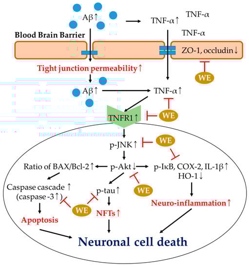 p-Akt expression related to cell survival easily inhibits the excessive inflammatory response. The down-expressed p-Akt affects the abnormalities of neurons through various pathways, such as the apoptosis pathway, production of neurofibrillary tangles (NFTs), and damaged antioxidant defense systems []. Excessive expression of p-JNK indicates a decrease in p-Akt, and continuously promotes the activity of p53 []. Activated p53 increases the ratio of Bcl-2-associated X protein (BAX)/Bcl-2 and the release of mitochondrial cytochrome C. The released cytochrome C stimulates an increase in the expression of caspase-3 and caspase-9, and this caspase cascade induces apoptosis []. Therefore, the regulation of p-Akt is ultimately associated with the inhibition of apoptosis, and this study suggests that walnut extract has a neuroprotective effect by inhibiting the apoptosis of neurons through the regulation of p-Akt and caspase-3. In addition, a decrease in p-Akt is associated with the expression of tau protein, regulating axonal transport, and the stabilization of microtubules in neurons. Normal Akt activity regulates the activation of glycogen synthase kinase-3β (GSK-3β), inhibiting the phosphorylation of tau related to stabilized microtubules []. However, reduced Akt activity induces tau phosphorylation without inhibiting GSK-3β activation []. This p-tau is continuously combined, with the produced tau as a dimer and oligomers forming on the axis of neurons, and ultimately leads to a decrease in synaptic plasticity and neuronal cell death by producing NFTs []. Therefore, walnut extract can inhibit neuronal death by inhibiting fibril formation of p-tau through the amelioration of p-Akt. The decrease in p-Akt also affects the reduction of the antioxidant system’s ability to eliminate ROS and oxidative stress []. p-Akt increases the expression of Nrf2 from Kelch-like, ECH-associated protein 1 (keap1), and the generated Nrf2 increases the expression of HO-1, NAD(P)H quinone oxidoreductase (NQO1), and SOD protecting the antioxidant system []. However, a decrease in p-Akt inhibits the normal function of the neuronal survival pathway, and accumulated oxidative stress leads to neuronal cell death []. This inhibition of a decrease in p-Akt is related to the protective effect of neurons. Therefore, this study confirmed the expression of caspase-3, p-tau, and HO-1 as the various sub-factors of Akt, and walnut intake showed an ameliorating effect on these proteins. According to Liu et al., walnut peptide inhibited the expression of cytochrome C, caspase-9, caspase-3, and poly (ADP-ribose) polymerase (PARP) related to neuronal cell death, and upregulated the expression of phosphorylated cAMP response element-binding protein (p-CREB) and synaptophysin to protect neuronal cells []. In addition, walnut oligopeptides reduced Aβ levels and p-tau production, and improved the expression of PI3K and the ratio of p-Akt/Akt in the aged SAMP8 mice hippocampus []. In addition, walnut (Juglans mandshurica Maxim.) leaf extract increased the levels of HO-1 and Nrf2 by increasing matrix metalloproteinase-1 (MMP-1) and inhibiting the extracellular signal-regulated kinase (ERK), p38 and JNK in H2O2-induced skin fibroblasts []. Ellagic acid, as one of the walnut metabolites, increases the expression of Nrf2 and HO-1 in the aorta, and it can protect cerebral neurons through the improvement of the antioxidant system of the BBB []. Therefore, it is considered that walnut extract inhibits neuronal cell death through the Akt pathway in amyloidogenic mice. However, the identification of additional peptides contained in walnuts will have to be performed. In some experiments, the effect in the WE 10 group was not significant. However, administration of walnut extract significantly improved cognitive function and the neuro-protective effect. In conclusion, it can be confirmed that walnut extract has a summative effect on Aβ-induced pathology and cognitive function improvement by improving the p-Akt pathway and inflammatory response via the ameliorating effect of BBB function.