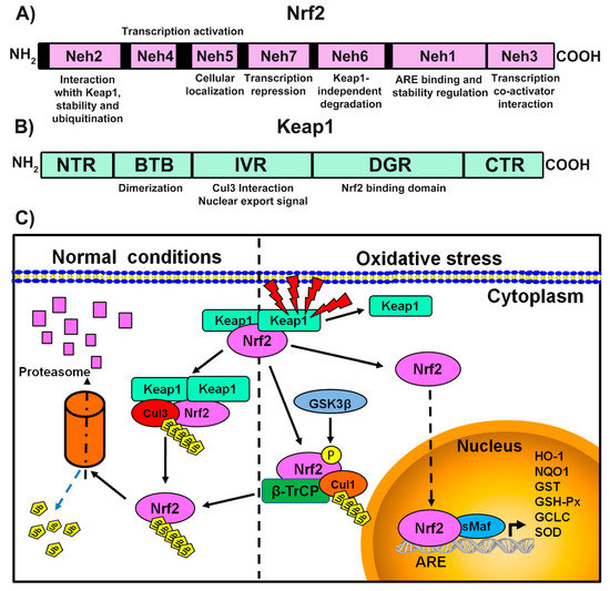 Schematic representation of the primary structure of Nrf2 (A) and Keap1 (B) domains and their respective functions. (C) Representation of regulatory mechanisms in Keap1/Nrf2 signaling. In normal conditions, Nrf2 remains inactive bound to its endogenous inhibitor Keap1; this heterodimer binds the Cul3-Rbx E3 ubiquitin ligase complex that triggers Nrf2 degradation by the proteasome. Under oxidative stress conditions, Nrf2 is released from Keap1 and translocates to the nucleus, forming a heterodimer with sMaf. Nrf2-sMaf heterodimers bind to ARE sequences promoting the expression of antioxidant genes. Alternatively, when Nrf2 is phosphorylated by GSK-3, β-TrCP mediates its interaction with a Cul1 ubiquitin ligase complex (Skp1-Cul1-Rbx1/Roc1) to promote the proteasomal degradation of Nrf2, thus inhibiting the expression of cytoprotective genes.
