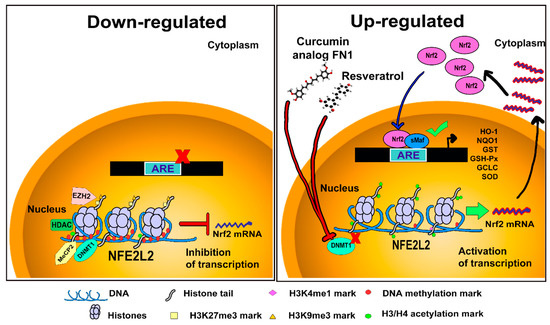 Epigenetic modifications of NFE2L2. The left panel shows epigenetic modifications that lead to downregulation of NFE2L2. Hypermethylation of both, DNA and histones, reduces the mRNA expression levels of Nrf2. The right panel shows that hypomethylation and acetylation of histones increase the mRNA expression levels of Nrf2 and consequently the activation of cytoprotective genes. Resveratrol and curcumin analog (FN1) reduce the activity of DNMT1 and increase the activity of HDACs, promoting the expression of Nrf2.