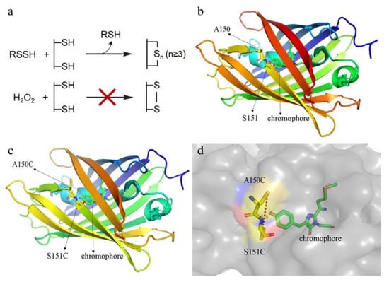 To avoid the disturbance caused by extracellular and intracellular compounds, we chose mCherry as the starting probe because its emission wavelength (λem,max = 610 nm) is out of the green range. The designing principle is to mutate two amino acid residues, whose locations are near the chromophore, to cysteine residues. Through controlling the distance of thiol groups of the two cysteine residues, a bridge with a –Sn– (n ≥ 3) bond can be formed when the probe reacts with reactive sulfane sulfur (Figure 1a). The –Sn– bond has π electrons, hence, it may affect the electron distribution of mCherry chromophore, thereby altering the excitation and/or emission wavelength of mCherry chromophore. Out of the consideration that –Sn– (disulfide) bond may have the same effect, which is easily formed when the mutant probe encounters ROS, the distance between the two thiol groups should be longer than 2.05 Å, the length of a disulfide bond [23].