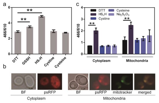 We then used psRFP to analyze the intracellular reactive sulfane sulfur of S. cerevisiae BY4742. It was expressed in BY4742 cytoplasm and mitochondria. For expression in cytoplasm, psRFP contained no signal peptide. For expression in mitochondria, psRFP was fused with an N-terminal signal peptide MLSARSAIKRPIVRGLATV. The recombinant yeast cells were treated with different sulfur-containing chemicals, and the 466/610 ratios were measured (Figure 6b). HSnH treatment led to an obvious increase of 466/610 ratios in both cytoplasm and mitochondria. Cysteine and thiosulfate caused slight increases of 466/610 ratios in mitochondria, but not in cytoplasm. In addition, the 466/610 ratios in mitochondria were generally higher than those in cytoplasm, suggesting that mitochondria should be the major production organelle in S. cerevisiae.