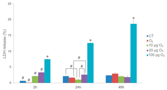 LDH assay on AT samples. Histograms show the mean value ± SE of percentage of tissue viability after 2 h, 24 h and 48 h from the treatment. Statistical difference is indicated by # (p < 0.05). The value referring to 100 μg O3 is statistically different from all other samples at each time point (* p < 0.001). CT, control.