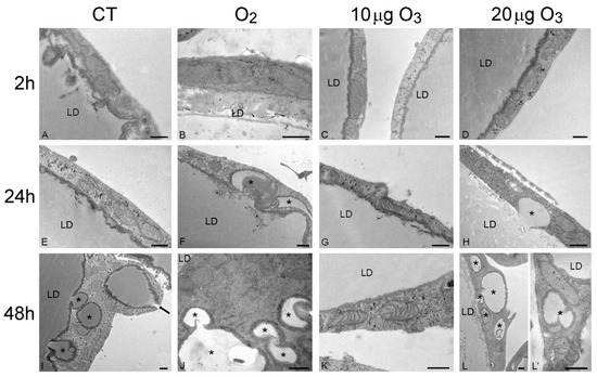 After 48 h, in control samples (Figure 3I) the adipocytes showed several small lipid droplets distributed in the cytoplasm and some of them were found to be extruding from the cell; however, no alteration of cell organelles was observed. In samples exposed to 10 μg O3 (Figure 3K), no lipid extrusion or organelle modification was ever observed, adipocyte morphology being very similar as at 2 h post-treatment. In samples treated with O2 (Figure 3J) or 20 μg O3 (Figure 3L,L′) many lipid droplets were found budding from the large central droplet and scattered in the cytoplasm; moreover, most mitochondria showed a few cristae, although all other organelles were still well preserved.