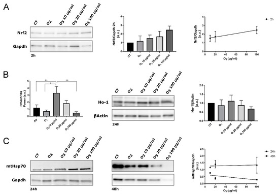 Biomolecular analysis of Nrf2, Hmox1/Ho-1 and mtHsp70 in control (CT), O2-, 10 µg O3-, 20 µg O3- and 100 µg O3-treated AT samples. (A) Western blot of Nrf2 protein. Nrf2 stabilization was observed 2 h after O3 treatment (Western blot and histogram). The protein level is proportional to the O3 concentration (linear regression p = 0.05; right). (B) Gene expression of Hmox-1 in AT at 4 h post-treatment (* p < 0.05, ** p < 0.005; left). The maximum level of Hmox1 expression was reached by treating samples with 10 µg/mL O3. The amount of Ho-1 protein was evaluated at 24 h post-treatment (Western blot and histogram; right). (C) mtHsp70 protein was evaluated at 24 h and 48 h post-treatment (left). The protein level is not significantly proportional to the O3 concentration (linear regression 24 h: p = 0.8; 48 h: p = 0.5; right). The values presented are means ± SE of 3 independent experiments. Data were normalized to the level of housekeeping proteins (Gapdh and βActin) and expressed as in proportion to the levels in control samples.
