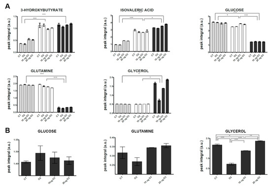 Visual inspection of the 1D 1H NMR spectra recorded on culture media derived from AT samples after gas exposure showed that the peak intensity and position of several metabolites were different among the samples (representative spectra are shown in Supplementary Materials, Figure S2). The variability and complexity of the spectra were interpreted by a multivariate statistical approach to identify the meaningful metabolites discriminating treated and control samples (Supplementary Materials, Multivariate data analysis, Results, Figure S3). Figure 5A shows the trend along the incubation times post-treatment of the identified metabolites with unequivocal assignment obtained from NMR (coefficients of variation for each analysed metabolite are reported in Supplementary Materials, Table S1). In the culture media, the levels of most metabolites remained constant at 2 h and 24 h. Only the levels of 3-hydroxybutyrate and isovaleric acid increased 24 h post-treatment in all samples, suggesting an increase in fatty acid catabolism. The 3-hydroxybutyrate is synthesized from acetyl-CoA through β-oxidation of fatty acids [45], and it is considered a signalling metabolite because it is taken up by peripheral tissues and oxidized for ATP production [46,47]. This finding therefore suggests that some lipid catabolism occurs in all AT samples after 24 h in culture independent of treatment, probably as a consequence of maintenance under in vitro conditions.