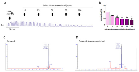 Effect of Salvia sclarea L. essential oil on prostaglandin (PG) F2α-induced uterine contraction and total sclareol content in Salvia sclarea L. essential oil. (A) Representative recordings of rat uterine tissue were induced with PGF2α (10−6 M) along with exposure of rat uterine smooth muscles to essential oil (at 10, 25, 50, 75, and 100 ppm.) (B) Dose-dependent effects of essential oil on the mean peak amplitude. Each column represents the mean ± standard error of the mean (SEM); n = 4; * p < 0.05, ** p < 0.001 compared to 0. (C) Ultra-performance liquid chromatography (UPLC)–MS/MS chromatogram of sclareol standard. (D) UPLC–MS/MS chromatogram of Salvia Sclarea essential oil.