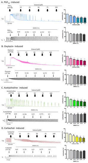 Effect of sclareol on drug-induced uterine contraction. Representative recordings of rat uterine tissues were induced with (A) 10−6 M PGF2α, (B) 10−6 M oxytocin, (C) 10−5 M carbachol, and (D) 10−6 M acetylcholine Ach, with exposure of rat uterine smooth muscles to sclareol (10, 25, 50, 75, and 100 μM). Dose-dependent effects of sclareol on the mean peak amplitude. Each column represents the mean ± SEM; n = 4–8. * p < 0.05, ** p < 0.01 and *** p < 0.001 compared to 0 (drug-induced only).
