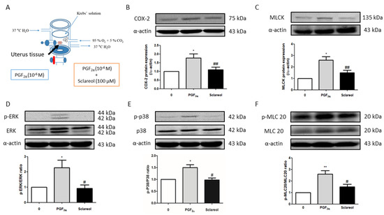 Possible mechanism underlying the effect of sclareol on PGF2α-induced uterine contraction. (A) Tissue collection method. After PGF2α-induced uterine contraction in the presence of 0 and 100 μM sclareol, the uterus was taken out (at 30 min). (B–F) Protein expression of cyclooxygenase-2 (COX-2), myosin light-chain kinase (MLCK), phosphorylated extracellular signal-regulated kinase (p-ERK), ERK, p-p38, p38, phosphorylated myosin light chain 20 (p-MLC20), MLC20, and α-actin during PGF2α-induced contraction at 30 min in rat uterus; n = 3–6; * p < 0.05, ** p < 0.001 compared to 0; # p < 0.05, ## p < 0.01 compared to PGF2α. Each column represents the mean ± SEM.