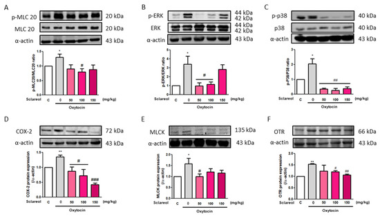 Effect of sclareol on uterine contraction-related protein expression in oxytocin-induced writhing test model. The (A) p-MLC20/MLC20, (B) p-ERK/ERK, (C) p-p38/p38, (D) COX-2, (E) MLCK, and (F) oxytocin receptor (OTR) levels were detected by Western blot. C, Control; 0, model control group; 50, sclareol 50 mg/kg; 100, sclareol 100 mg/kg; 150, sclareol 150 mg/kg; n = 4–6; * p < 0.05, ** p < 0.01 compared to C; # p < 0.05, ## p < 0.01, ### p < 0.001 compared to the sclareol 0 mg/kg group. Each column represents the mean ± SEM; n = 3–5.