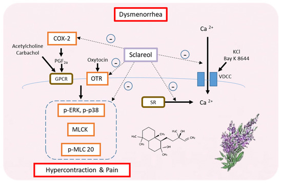 Our findings suggest that sclareol is a potential natural product that can treat primary dysmenorrhea. In fact, this is the first study showing the relationship between sclareol and dysmenorrhea. Furthermore, sclareol improved dysmenorrhea via downregulating the protein expression of OTR, MLCK, COX-2, p-ERK, p-p38, and p-MLC20 and regulating the concentration of intracellular calcium. Hence, sclareol may ameliorate primary dysmenorrhea and inflammation (Figure 8).