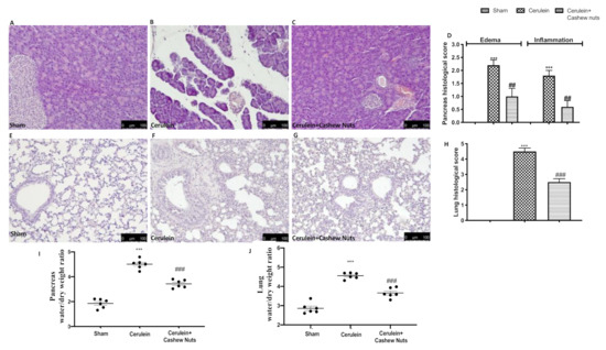 Evaluation of histological damage and oedema in the pancreas and lung of mice with cerulein-induced acute pancreatitis (AP). Pancreas: (A) sham, (B) cerulein, (C) cerulein+cashew nuts, (D) pancreas histological score, (I) pancreatic oedema. Lung: (E) sham, (F) cerulein, (G) cerulein + cashew nuts, (H) lung histological score, (J) lung oedema. Values shown are means ± SEM of 6 mice. *** p < 0.001 vs. sham; ## p < 0.01 vs. cerulein; ### p < 0.001 vs. cerulein.