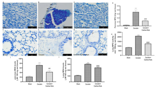 Effects of cashew nuts on cerulein-induced mast cell degranulation and MPO and MDA activity. Pancreas: (A) sham, (B) cerulein, (C) cerulein+cashew nuts, (D) MPO and (I) MDA. Lung: (E) sham, (F) Cerulein, (G) cerulein+cashew nuts, (H) MPO and (J) MDA. Arrows indicate mast cells. Values shown are means ± SEM of 6 mice. *** p < 0.001 vs. sham; ## p < 0.01 vs. cerulein; ### p < 0.001 vs. cerulein.