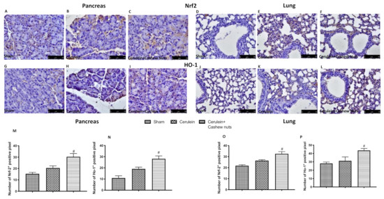 Effects of cashew nuts on the Nrf2 pathway in cerulein-induced AP as assessed by immunohistochemistry. Immunohistochemical staining for Nrf2 and HO-1 in pancreatic and lung tissue. Nrf2 immunohistochemical staining in pancreas ((A) sham, (B) cerulein, (C) cerulein+cashew nuts) and lung ((D) sham, (E) cerulein, (F) cerulein+cashew nuts), and relative densitometric quantification in pancreas (M) and lung (O). HO-1 immunohistochemical staining in pancreas ((G) sham, (H) cerulein, (I) cerulein+cashew nuts) and lung ((J) sham, (K) cerulein, (L) cerulein+cashew nuts) and relative densitometric quantification in pancreas (N) and lung (P). Values shown are means ± SEM of 6 mice. # p < 0.05 vs. cerulein.