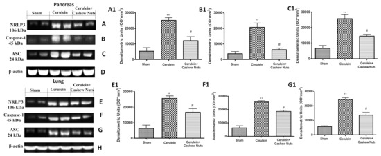 Finally, we evaluated whether cashew nuts could reduce inflammasome activation in cerulean-induced AP. Analysis of inflammasome components by Western blotting showed that the protein abundance of NLRP3 increased significantly in pancreas (Figure 6A,A1) and lung (Figure 6E,E1). The same was observed for the protein abundance of ASC in pancreas (Figure 6C,C1) and lung (Figure 6G,G1), as well as for the protein abundance of Caspase-1 in pancreas (Figure 6B,B1) and lung (Figure 6F,F1); administration of cashew nuts significantly ameliorated all of the above parameters.