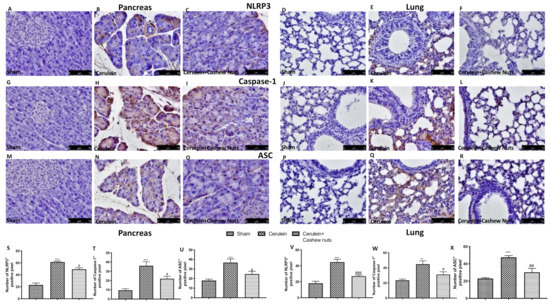 These results were further confirmed by immunohistochemical staining for NLRP3 in pancreas (Figure 7A–C,S) and lung (Figure 7D–F,V), as well as for Caspase-1 in pancreas (Figure 7G–I,T) and lung (Figure 7J–L,W), and for ASC in pancreas (Figure 7M–O,U) and lung (Figure 7P–R,X).