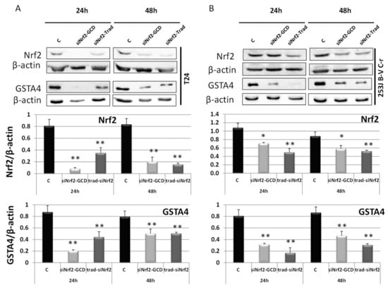 3.2.2. siNrf2-GCD Down-Regulated the Expression of Nrf2 and its Target Gene GSTA4 in CDDP-Resistant Bladder Cancer Cells