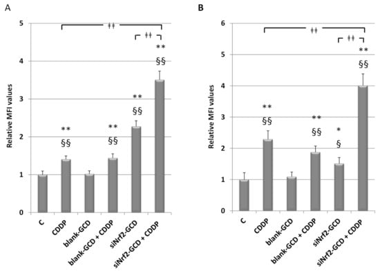 3.2.5. siNrf2-GCD Treatment Enhanced Intracellular Oxidative Stress Caused by CDDP Treatments