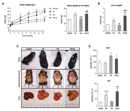 HFHS diet causes body and liver weight gain and increases ALT levels.  (A) Body weight gain profile during the 16-week feeding period (left panel) and body weight at the end of the feeding period (right panel) (N = 18). (B) Liver weight at the end of the feeding period (N = 4). (C) Representative images of body, abdominal cavity and liver appearance at the end of the feeding period. (D) Plasma AST and ALT levels (N = 4). All data are expressed as the mean ± SEM. (§) vs. the HF diet (P < 0.05); (**) vs. the CHOW diet, (§§) vs. the HF diet and (##) vs. the HS diet (P < 0.01); (***) vs. the CHOW diet, (§§§) vs. the HF diet and (###) vs. the HS diet (P < 0.001); P values were determined using one-way ANOVA followed by Bonferroni’s post hoc test. HF, high-fat; HS, high-sucrose; HFHS, high-fat plus high-sucrose; AST, aspartate aminotransferase; ALT, alanine aminotransferase.