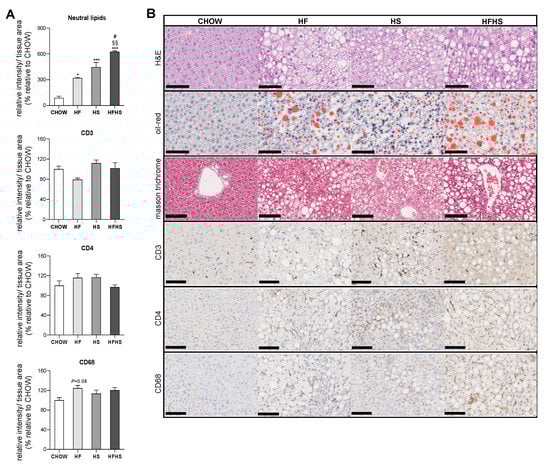 Steatosis is caused by prolonged consumption of a HF or HS diet but was aggravated to fibrosis initiation by the combined HFHS diet. Established by Kleiner et al., the NAFLD activity score (NAS) grades NAFLD according to three main criteria: steatosis, inflammation and fibrosis []. As previously reported [], an increase in body mass index is well correlated with the development of steatosis, as this stage is diagnosed by the presence of fat in at least 5% of hepatocytes. According to the NAS criteria, the HF, HS and HFHS diets cause similar levels of steatosis (Grade 3: > 66%) (Supplemental  Table S3). A detailed analysis of Oil Red O staining revealed that among the diets, the HFHS diet was associated with the most pronounced fat accumulation (six-fold increase) in the liver. Additionally, the HF and HFHS diets were associated with macrosteatosis, whereas microsteatosis was more apparent in the HS-diet-fed mice (Figure 2A,B). Decreased levels of glycogen were found in all experimental groups with hypercaloric diets compared with the CHOW group (Supplemental  Figure S1A,B).