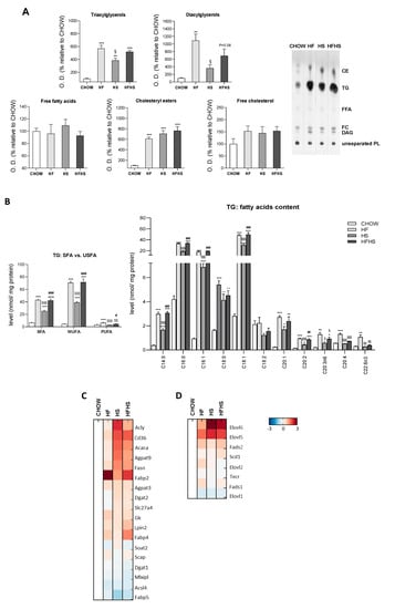 Despite the similar content of SFAs (14%) and unsaturated fatty acids (USFAs) (12%) in the HF diet (Supplemental  Table S1), MUFAs were highly increased in the accumulated hepatic TGs in the HF- and HFHS-diet-fed mice (Figure 3B). Although to a lower extent, similar tendencies were observed in the HS-diet-fed group. Increased accumulation of SFAs (C14:0, C16:0 and C18:0) was found in the hepatic TGs of all treated mouse groups compared with the CHOW group (Figure 3B). Moreover, the C16:1, C18:1 and C20:1 MUFA species were especially highly abundant relative to PUFAs, such as C20:2, C20:3n6, C20:4 and C22:6n3, which were only slightly elevated in the HF- and/or HFHS-diet-fed mice compared with the CHOW-fed mice (Figure 3B). MUFAs abundance was associated with an elevated content of elongases (elongation of very-long-chain fatty acids protein (ELOVL) 5/6) and desaturases (acyl-CoA desaturase 1 (SCD-1) and fatty acid desaturase (FADS) 2), while the low content of ELOVL1/2 and FADS1 correlated with no significant enrichment in PUFAs (Figure 3D). These changes indicate substantial similarities in FAs composition in the liver lipid droplets of the HF- and HS-diet-fed mice.
