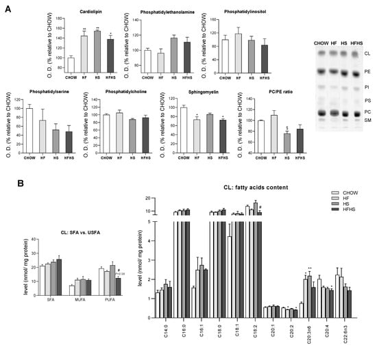 Liver mitochondria from HS- and HFHS-diet-fed mice are enriched in cardiolipin (CL) but show reduced phosphatidylcholine (PC)/phosphatidylethanolamine (PE) ratio. Due to the central role of mitochondria in lipid metabolism, we next analyzed the lipidomic profile of liver mitochondria from mice fed the experimental diets. While no significant alterations were observed in their PC content, increased levels of PE were found in the liver mitochondrial membranes of the HS- and HFHS-diet-fed mice compared with those of the CHOW group (Figure 4A). The levels of both major constituents of mitochondrial membranes are used to calculate the PC/PE ratio, an important indicator of mitochondrial membrane fluidity and integrity. A decreased PC/PE ratio in the liver mitochondria of the HS- and HFHS-diet-fed mice compared with those of the CHOW-diet-fed mice was observed (Figure 4A), indicating the maintenance of membrane fluidity. The relative abundance of SFAs/USFAs in PC and PE was measured. PUFAs were decreased in PC (Supplemental  Figure S2B) but tended to be increased in PE in the HS and HFHS groups compared with the CHOW group (Supplemental  Figure S2A). According to the HF diet composition, the HF and HFHS diets reduced the abundance of 18:2 in both phospholipids (Supplemental  Table S1  and  Figure S2A,B).