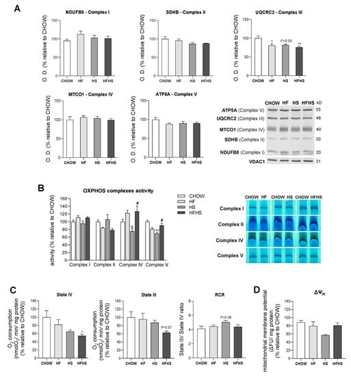 The HFHS diet decreases mitochondrial respiration. (A) Optical density (arbitrary units) of OXPHOS subunits (NDUFB8, Complex I; SDHB, Complex II; UQCRC2, Complex III; MTCO1, Complex IV; and ATP5A, Complex V) levels and representative Western blot images. VDAC1 was used as a loading control (N = 4). (B) OXPHOS complex activities and in-gel activities representative image (N = 4). (C) Oxygen consumption rate in the basal state (State IV) and in the ADP-stimulated state (State III) and RCR (State III/State IV) (N = 6). (D) Mitochondrial membrane potential (N = 8). All data are expressed as the mean ± SEM. (*) vs. the CHOW diet, (§) vs. the HF diet and (#) vs. the HS diet (P < 0.05); (**) vs. the CHOW diet (P < 0.01); P values were determined using one-way ANOVA followed by Bonferroni’s post hoc test or Kruskal–Wallis test followed by Dunn’s post hoc test. ΔΨm, mitochondrial membrane potential; HF, high-fat; HFHS, high-fat plus high-sucrose; HS, high-sucrose; RCR, respiratory control ratio.