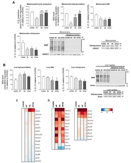 Hepatic oxidative damage with no signs of mitochondrial ROS production in diet-induced nonalcoholic fatty liver (NAFL). (A) Rate of mitochondrial H2O2 production, levels of mitochondrial lipid peroxidation and optical density (arbitrary units) of mitochondrial protein oxidative damage (DNP and nitrotyrosine), with representative Western blot images. VDAC1 was used as a loading control (N = 4). (B) Levels of lipid peroxidation and optical density (arbitrary units) of protein oxidative damage (DNP and nitrotyrosine) in hepatic tissue lysate, with representative Western blot images. Actin was used as a loading control (N = 4). (C) Proteomic analysis of protein levels involved in mt-FAO (N = 4). (D) Proteomic analysis of protein levels involved in peroxisomal FAO and in peroxisomal abundance (N = 4). Blue represents decreased levels, and red represents increased levels. Data are expressed as the mean ± SEM. (*) vs. the CHOW diet, (§) vs. the HF diet and (#) vs. the HS diet (P < 0.05); (**) vs. the CHOW diet and (§§) vs. the HF diet (P < 0.01); (***) vs. the CHOW diet and (§§§) vs. the HF diet (P < 0.001); P values were determined using one-way ANOVA followed by Bonferroni’s post hoc test. DNP, dinitrophenyl; HF, high-fat; HFHS, high-fat plus high-sucrose; HS, high-sucrose.