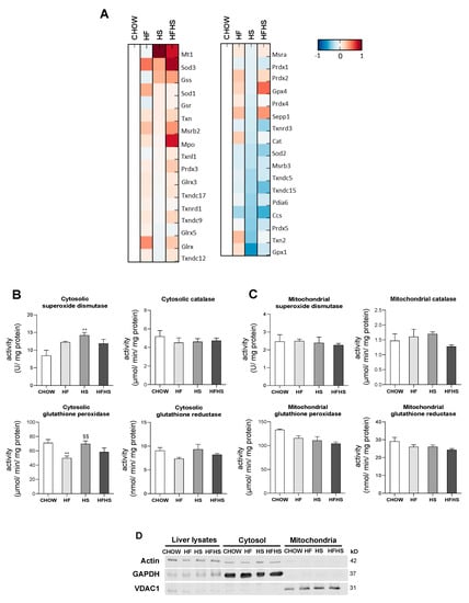 HF, HS and HFHS diets lead to an imbalance in antioxidant enzyme activities in the cytosolic fraction but not in the mitochondrial fraction. (A) Proteomic analysis of antioxidant enzyme levels in hepatic tissue (N = 4). Blue represents decreased levels, and red represents increased levels. (B) Antioxidant enzyme activities of superoxide dismutase (SOD), catalase, glutathione peroxidase (GPX) and glutathione reductase (GR) in the hepatic cytosolic fraction (N = 4). (C) Antioxidant enzyme activities of SOD, catalase, GPX and GR in the hepatic mitochondrial fraction (N = 4). (D) Representative Western blot images showing the purity of the hepatic cytosolic and mitochondrial fractions. GAPDH and VDAC1 were used as the cytosolic and mitochondrial loading controls, respectively. All data are expressed as the mean ± SEM. (**) vs. the CHOW diet and (§§) vs. the HF diet (P < 0.01); P values were determined using one-way ANOVA followed by Bonferroni’s post hoc test. GAPDH, glyceraldehyde-3-phosphate dehydrogenase; HF, high-fat; HFHS, high-fat plus high-sucrose; HS, high-sucrose; VDAC1, voltage-dependent anion channel 1.
