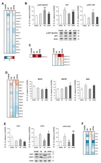 HF, HS and HFHS diets affect the protein homeostasis network. We evaluated PI3K/AKT/mTOR signaling as a key regulator of the cellular adaptive response to oxidative stress. Although MS-based proteomic analysis of the PI3K/AKT/mTOR axis showed no major changes (Figure 8A), phosphorylation of AKT at Ser473 and the p-AKT/AKT ratio indicated activation of this pathway in the HS-diet-fed mice. Compared with the CHOW-fed mice, the HF- and HFHS-diet-fed mice exhibited an upward trend in p-AKT (Ser473) together with increased total AKT levels (Figure 8B). Consistent with the activation of this pathway, increased levels of proteins involved in protein translation inhibition (EIF4EBP1) and protein synthesis (mainly RPS6KA1 and RPS6KA3) were found in the high-caloric diets (Figure 8C). Importantly, autophagy, a key cellular stress response and quality control mechanism (regulated by PI3K/AKT/mTOR signaling), appeared to be affected. MS-based proteomic and Western blot analyses showed the reduced expression of the main autophagic proteins (autophagy-related proteins (ATGs) and beclin-1 (BECN1)) in the HF-, HS- and HFHS-fed groups compared with the CHOW-diet-fed group. However, an increase of 120% and 170% in the autophagosome-associated LC3-II/LC3-I ratio and increased sequestosome-1 (SQST1M) and especially autophagy cargo receptor (NBR1) levels (which is involved in the recognition of ubiquitin-modified unknown peroxisomal membrane proteins) in the HF- and HFHS-diet-fed mice indicate the possible blockade of autophagosomal clearance (Figure 8D,E). In fact, this assumption is supported by a reduction in enzymes responsible for lysosomal acidification and, consequently, autolysosomal proteolysis. We observed decreased levels of cathepsin D in the livers of the HF-diet-fed mice and decreased levels of cathepsins B and L in the HF- and HFHS-diet-fed mice compared with the CHOW-diet-fed mice (Figure 8F). Thus, exposure to all hypercaloric diets affects cellular proteostasis, and fat seems to be harmful for the clearance of damaged organelles and biomolecules.