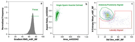 Initial Data Gating Approach. This strategy gated for cells in (a) focus, (b) single sperm cells as defined by Hoechst 33342, and (c) anteriorly/posteriorly aligned as opposed to laterally aligned (plot colored by density [least dense to most dense: blue, green, yellow, orange, red]).