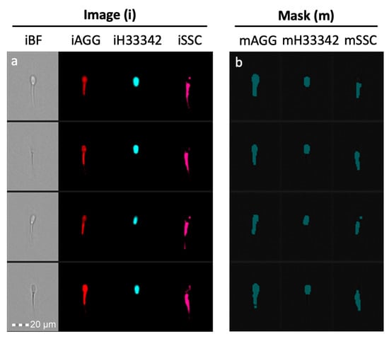 Masking Approach. (a) Brightfield (BF) aggresome (AGG) Hoechst 33342 (H33342) and side scatter (SSC) images of each spermatozoa were collected. (b) Masks that capture the fluorescent area of probe. Images are designated with an “i” and masks designated with an “m”.