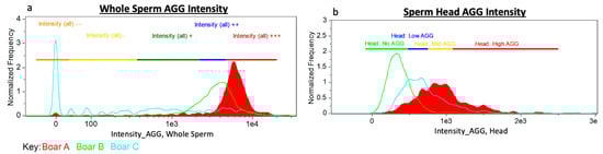 Gating Approach. Three boars with varying aggresome probe localization as examples of the gating strategy used for: (a) whole sperm AGG intensity and (b) sperm head (only) AGG intensity.