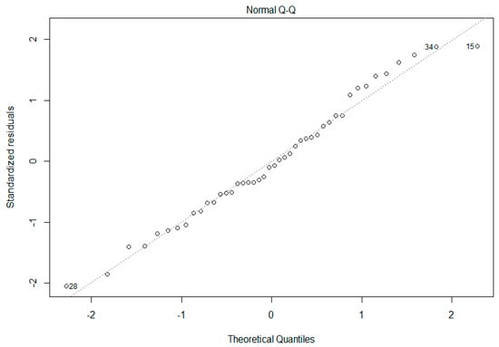 Normal Quantile-Quantile Plot. Plot showing the standardized residuals (y-axis) as a function of quantiles expected with the same mean and variance as the empirical distribution (x-axis). Individual boars (28, 34, & 15) more than 5% away from the predicted value are numerated.