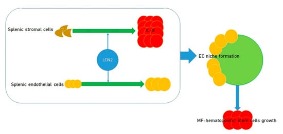 Effect of LCN2 on the growth of myelofibrosis (MF) hematopoietic stem cells. LCN2 fosters the growth of splenic endothelial cells, causing the enhanced production of IL-8 by splenic stromal cells. Such an increase plays a role in the formation of an endothelial cell niche, which, in turn, promotes the growth of myelofibrosis hematopoietic stem cells.