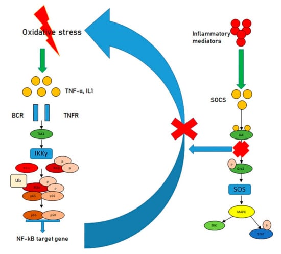 Oxidative stress has been reported to stimulate the NF-κB pathway which, in turn, causes a self-perpetuating vicious circle in which oxidative stress generates ROS that in turn produces more oxidative stress [,,]. To escape such conditions, the system employs the suppressors of cytokine signaling (SOCS), a group of proteins committed to producing negative feedback loops that are generally stimulated by inflammatory mediators [,]. The stimulated SOCS proteins link to JAKs and interrupt the JAK–STAT pathway, thus guaranteeing that the inflammatory process does not continue (Figure 2).