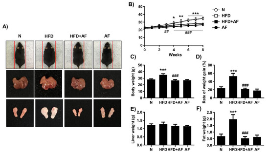 Auranofin attenuates body weight gain and the epididymal fat pad in the high-fat diet (HFD)-induced non-alcoholic fatty liver disease (NAFLD) mouse model. Animals were fed a 60% HFD (60% of calories from fat) and/or a regular diet and also received intraperitoneal injection of auranofin (10 mg/kg) and/or normal saline for 8 weeks. (A) Representative photographic images of the whole mouse body, liver, and epididymal fat pad specimens in each group. (B) Body weight gain for 8 weeks. Data are expressed as the mean ± SD (n = 10). * p < 0.05, ** p < 0.01, and *** p < 0.001 compared with the normal group. ## p < 0.01 and ### p < 0.001 compared with HFD group. (C–F) The average values for body weight, rate of weight gain, liver and epididymal fat pad after the study period. Data are expressed as the mean ± SD (n = 8). *** p < 0.001 compared with the normal group. ### p < 0.001 compared with HFD group. N, normal group; HFD, HFD fed group; HFD+AF, HFD fed and auranofin injection group; AF, auranofin injection group.