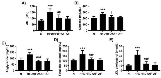 Auranofin improves HFD-induced suppression of the hepatic function and lipid accumulation in serum. Following treatment with or without HFD and auranofin for 8 weeks, the blood was collected, and the serum was analyzed. (A–E) The serum analysis results are expressed in the graph. Data are expressed as the mean ± SD (n = 8). *** p < 0.001 compared with the normal group. # p < 0.05, ## p < 0.01, and ### p < 0.001 compared with HFD group. N, normal group; HFD, HFD fed group; HFD+AF, HFD fed and auranofin injection group; AF, auranofin injection group.