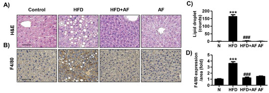 Auranofin alters morphological changes and macrophage infiltration in the liver of the HFD-induced NALFD mouse model. (A) The histological changes were assessed by H&E staining. Scale bar—50 μm. (B) The expressions of F4/80 were evaluated by immunohistochemistry (IHC) using specific antibodies. Representative images of F4/80-positive cells. Scale bar—50 μm. (C) The lipid droplets per area were counted and expressed in graph. (D) Quantification of the F4/80 expression in area. Data are expressed as means ± SD (n = 3). *** p < 0.001 compared with the normal group. ### p < 0.001 compared with HFD group. N, normal group; HFD, HFD fed group; HFD+AF, HFD fed and auranofin injection group; AF, auranofin injection group.