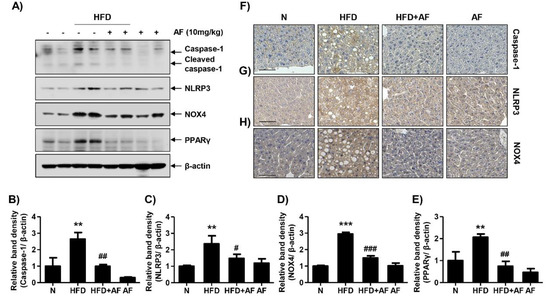 Auranofin reduces NOD-like receptor family pyrin domain containing 3 (NLRP3) inflammasome-associated proteins, NADPH oxidase 4 (NOX4) and peroxisome proliferator-activated receptor γ (PPARγ) expression in the liver of the HFD-induced NAFLD mouse model. (A) Western blots of caspase-1, NLRP3, NOX4 and PPARγ were performed with the liver tissue. (B–E) Quantification of activated caspase-1, NLRP3, NOX-4 and PPARγ. Data are expressed as means ± SD (n = 4). ** p < 0.01 and *** p < 0.001 compared with the normal group. # p < 0.05, ## p < 0.01, and ### p < 0.001 compared with HFD group. (F–H) To evaluate the hepatic expression of caspase-1, NLRP3 and NOX4, paraffin blocks of liver were section into 4 μm thicknesses and stained with specific antibodies (n = 3). Scale bar—50 μm. N, normal group; HFD, HFD fed group; HFD+AF, HFD fed and auranofin injection group; AF, auranofin injection group.