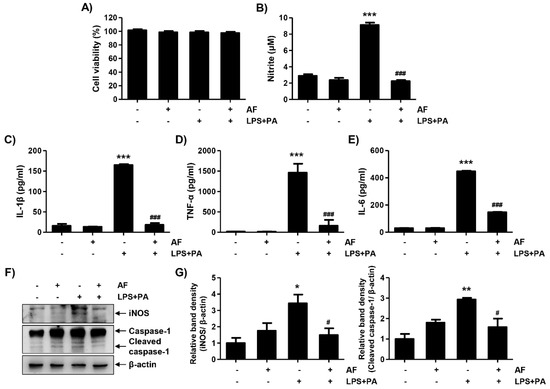 Auranofin suppresses LPS and PA-induced inflammation in primary hepatocytes. The cells were pretreated with auranofin (1.5 μM) for 1 h and treated with LPS and PA for 24 h. (A) Cell viability was estimated by 3-(4,5-dimethylthiazol-2-yl)-2,5-diphenyltetrazolium bromide (MTT) assay. The absorbance was measured using the microplate reader at 540 nm and compared to the control which was set to 100%. Data are expressed as means ± SD (n = 6). (B–E) Nitrite and proinflammatory cytokines, including IL-1β, TNF-α and IL-6, were assessed using Griess reagent and ELISA kit. The absorbance was measured using the microplate reader. The error bars represent the standard deviation of three independent experiments. Statistical analysis was performed using an ANOVA with Tukey’s post-hoc test (n = 6). (F) The cells were lysed, and a Western blot was performed to evaluate the expression of inducible nitric oxide synthase and caspase-1. Equal protein loading was confirmed by β-actin expression. (G) Quantification of iNOS and activated caspase-1 expression. Data are expressed as means ± SD (n = 2). * p < 0.05, ** p < 0.01, and *** p < 0.001 compared with un-treated cells. # p < 0.05 and ### p < 0.001 compared with LPS and PA-treated cells. AF, auranofin; PA, palmitic acid; LPS, lipopolysaccharide.