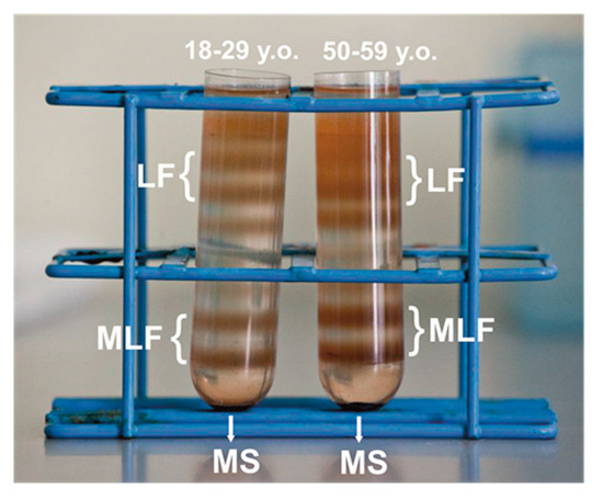 Melanolipofuscin (MLF) granules identified as two orange-brown fractions in discontinuous sucrose density gradient after centrifugation of retinal pigment epithelium (RPE) homogenates isolated from younger (18–29 y. o.) or older (50–59 y. o.) human donors. MLF granules containing less melanin formed fraction at the 1.6 M/1.8 M interface, while MLF granules containing more melanin formed a heavier fraction at the 1.8 M/2.0 M interface. The heaviest melanosomes fraction (MS) and the lightest lipofuscin fractions (LF) are also shown in the picture.