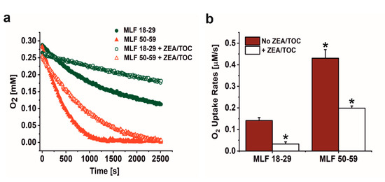 The effect of antioxidants on oxygen uptake induced by irradiation of melanolipofuscin (MLF) granules isolated from younger (18–29 y. o.) and older (50–59 y. o.) human donors monitored by EPR oximetry. (a) Oxygen uptake in irradiated MLF samples isolated from donors: 18–29 y. o. (solid, green circle) or 50–59 y. o. (solid, red triangle) and in suspension of granules from younger donors (open, green circle) and from older donors (open, red triangle), enriched with combination of antioxidants. (b) Calculated rates of light induced oxygen uptake in suspensions of MLF with no antioxidants (no ZEA/TOC) (brown bar) and samples supplemented with mixture of zeaxanthin and α-tocopherol (+ ZEA/TOC) (white bar). Values are means of three replicate samples (error bars indicate SD (n = 3)). Outcomes differed significantly between irradiated MLF samples from each donors group (18–29 y. o. and 50–59 y. o.) and between light treated MLF_18-29 and MLF_50-59 without and with antioxidants, as indicated by asterisks (t-test analyses, p < 0.05).