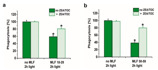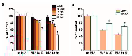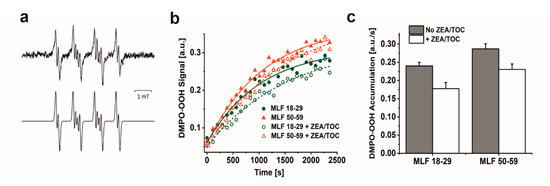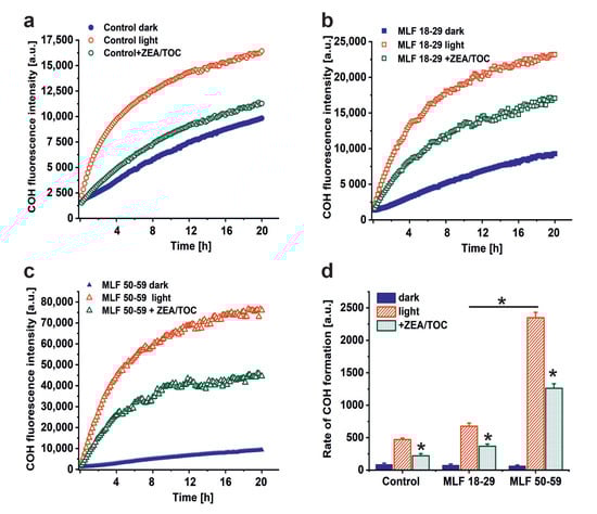 For photoreactivity experiments in model systems and for detection of singlet oxygen, suspensions of MLF (1 × 108 granules/mL or 1 × 109 granules/mL) was enriched with antioxidants by incubation of the granules in PBS with ZEA and TOC (at final concentrations 10 and 100 µM, respectively) for 24 h at 4 °C, as described previously [13,36]. After incubation with antioxidants, MLF granules were centrifuged (5242 g/15 min), suspended in fresh PBS, and used in planned experiments.