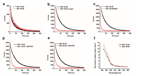 The ability of MLF to photogenerate singlet oxygen was examined by direct detection of singlet oxygen, based on time-resolved measurements of near-infrared phosphorescence [52]. Even though this method is very sensitive and specific, its application to highly dispersive and intrinsically unstable samples such as aqueous suspension of MLF granules is quite challenging. To homogenize and stabilize melanolipofuscin suspension in D2O, the measurements were carried out after addition of 1% n-dodecyl-β-D-maltopyranoside (DDM). This mild detergent was successfully used in our previous studies to determine photogeneration of singlet oxygen by lipofuscin and melanin granules [13,36]. Representative data of the detected 1270 nm phosphorescence, shown in Figure 4a, indicate that MLF from younger and older donors photogenerate almost equal fluxes of singlet oxygen when excited 420 nm. The singlet oxygen nature of the observed phosphorescence was confirmed by control experiments, in which the long-lived phosphorescence signal was practically eliminated by saturating the samples with argon (Figure 4b) and significantly quenched by addition of 0.5 mM azide, an efficient physical quencher of singlet oxygen (Figure 4c). Substantial quenching of the singlet oxygen phosphorescence was also observed after enrichment of MLF granules with 10 µM ZEA and 100 µM TOC (Figure 4d,e). This is to be expected in view of the reported very high efficiency of carotenoids to quench singlet oxygen [32]. Thus, the data suggest that the inherent photoreactivity of MLF could be substantially reduced by natural antioxidants such as zeaxanthin and vitamin E.