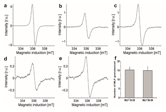 Representative EPR spectra recorded for: (a) synthetic dopamelanin (0.5 mg/mL), (b) melanin in melanolipofuscin granules isolated from younger human donors (18–29 years old) (109/mL), (c) melanin in melanolipofuscin granules isolated from older human donors (50–59 years old) (109/mL), (d) melanin in 7.34 × 106 ARPE-19 cells fed MLF_18-29 granules, and (e) melanin in 5.77 × 106 ARPE-19 cells fed MLF_50-59 granules. (f) Calculated number of MLF_18-29 or MLF_50-59 granules per cell. All samples were measured in liquid nitrogen using a standard finger-type quartz dewar. All measurements were repeated three times.