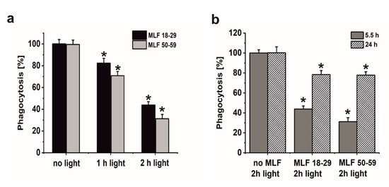 A major goal of this study was to examine if sublethal photic stress mediated in ARPE-19 cells by internalized melanolipofuscin granules could inhibit the cell phagocytosis of fluorescently labeled photoreceptor outer segments (POS). Figure 8a shows that blue light irradiation of cultures fed melanolipofuscin granules induced marked inhibition of the specific phagocytosis of POS membranes, with the effect being more significant in cultures containing MLF granules isolated from older donors (Figure 8a). Phagocytic activity of ARPE-19 cultures fed MLF decreased with the photic stress in a dose-dependent manner, reaching about 44% of nontreated controls in cells containing MLF_18-29 irradiated for 2 h (Figure 8a), and in cultures fed MLF_50-59, the observed POS uptake was reduced to about 32% of control (Figure 8a). It must be emphasized that the observed inhibition of the phagocytosis was transient; when POS were delivered to cells 24 h after induction of photic stress mediated by MLF granules, the efficiency of the cells to phagocytose POS substantially recovered (up to 78.5% for MLF_18-29 and up to 77.7% for MLF_50-59) (Figure 8b). Control experiments confirmed the photochemical nature of the MLF-mediated inhibition of the specific phagocytosis of ARPE-19 cells. Thus, neither MLF granules without light nor blue light treatment without MLF affected phagocytic activity of the cells (data not shown).
