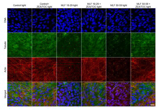 For the analysis of cell cytoskeleton, ARPE-19 cells were seeded on microscope slides in 48-well plates at a density of 105 cells/cm2. Cells were fed MLF_18-29 or MLF_50-59 granules with or without supplementation with antioxidants and immediately after induction of photic stress the cells were fixed with 3.7% formaldehyde, permeabilized with 0.1% Triton X-100, and blocked with 1% BSA. Subsequently, cells were immunostained with mouse monoclonal anti-human-tubulin IgG (Sigma-Aldrich) and Alexa Fluor 488-conjugated goat anti-mouse IgG (Life Technologies), and counterstained with Alexa Fluor 568-phalloidin (Life Technologies) and Hoechst 33342 (Sigma-Aldrich). Images of the cell cytoskeleton were obtained with scanning laser confocal microscope (LSM 900 with Airyscan 2, Carl Zeiss AG, Jena, Germany). Images were analyzed using ZEN Blue software (Carl Zeiss AG). Detailed description of the analysis can be found elsewhere [49].