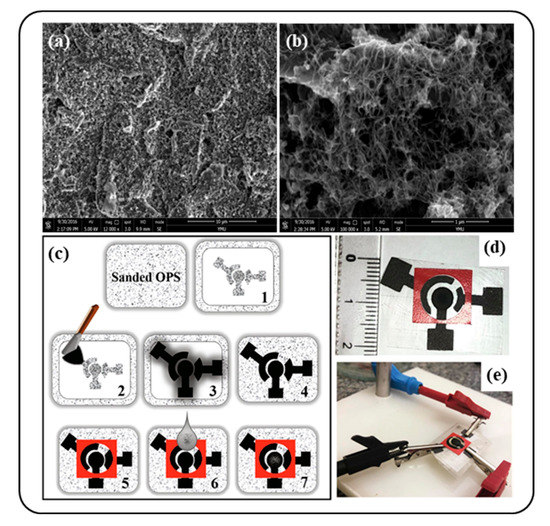 (a) The SEM characterization of the bare screen-printed electrode (SPE) and (b) the multi-walled carbon nanotubes modified screen-printed electrode. Reprinted from Ref. [57] with permission from MDPI. Schematic representation of (c) SPE preparation, (d) images of the final device, and (e) the final SPE connected to the potentiostat. Reprinted with permission from Ref. [59]. Copyright (2020) Elsevier.